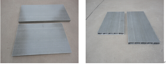 該產(chǎn)品是由不飽和聚酯樹脂、阻燃劑、玻璃纖維無捻粗紗、玻璃纖維縫編織物、色料、相關(guān)填料等復(fù)合后一次性整體拉擠制成。其結(jié)構(gòu)是由上下兩個橫板面、中間六個豎板面構(gòu)成的五個連續(xù)空心腔體組成的整塊蓋板,簡稱空心蓋板。樣品圖示:
