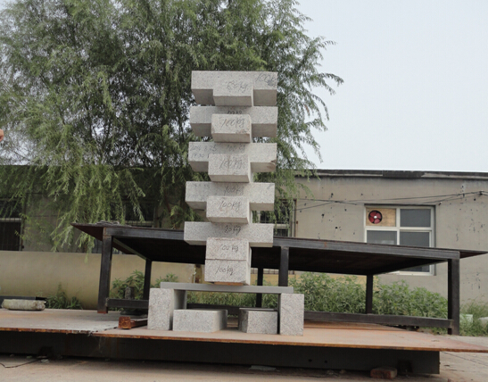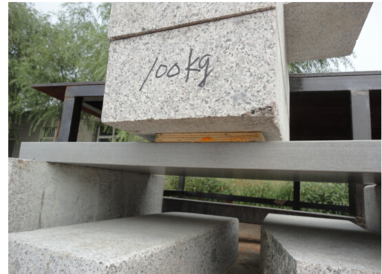 下面圖片是溝蓋板在做靜載試驗時的狀況。試塊總重量為1100公斤,樣品為長度1米的溝蓋板。兩端支撐面各長100毫米,試壓點在溝蓋板中心200毫米范圍,底部壓有一木板寬200毫米(上圖為整體圖,下圖為底部木板放大圖)。試驗首日溝蓋板中心下沉2毫米,也就是撓度2毫米。連續(xù)靜壓第30天時,中心下降度即撓度不變?nèi)詾?毫米。