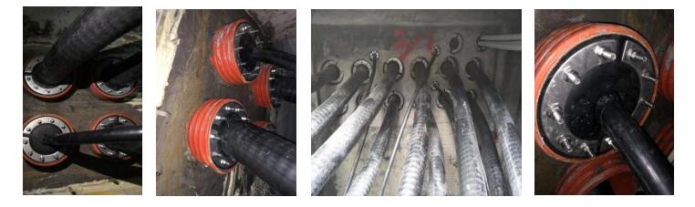 安裝時將封堵器初步裝配在一起,套在電纜上并將它推入電纜管內(nèi)合適位置后,將螺栓均衡逐步緊固到位即可。緊固時需用套筒扳手緊固,若有條件*好使用電動套筒扳手緊固。如果封堵器與電纜或與電纜管之間縫隙較大時,可加膠帶纏繞解決或使用密封膠解決。該產(chǎn)品的特點也是安裝方便、密封可靠和成本較低。工程案例如下: