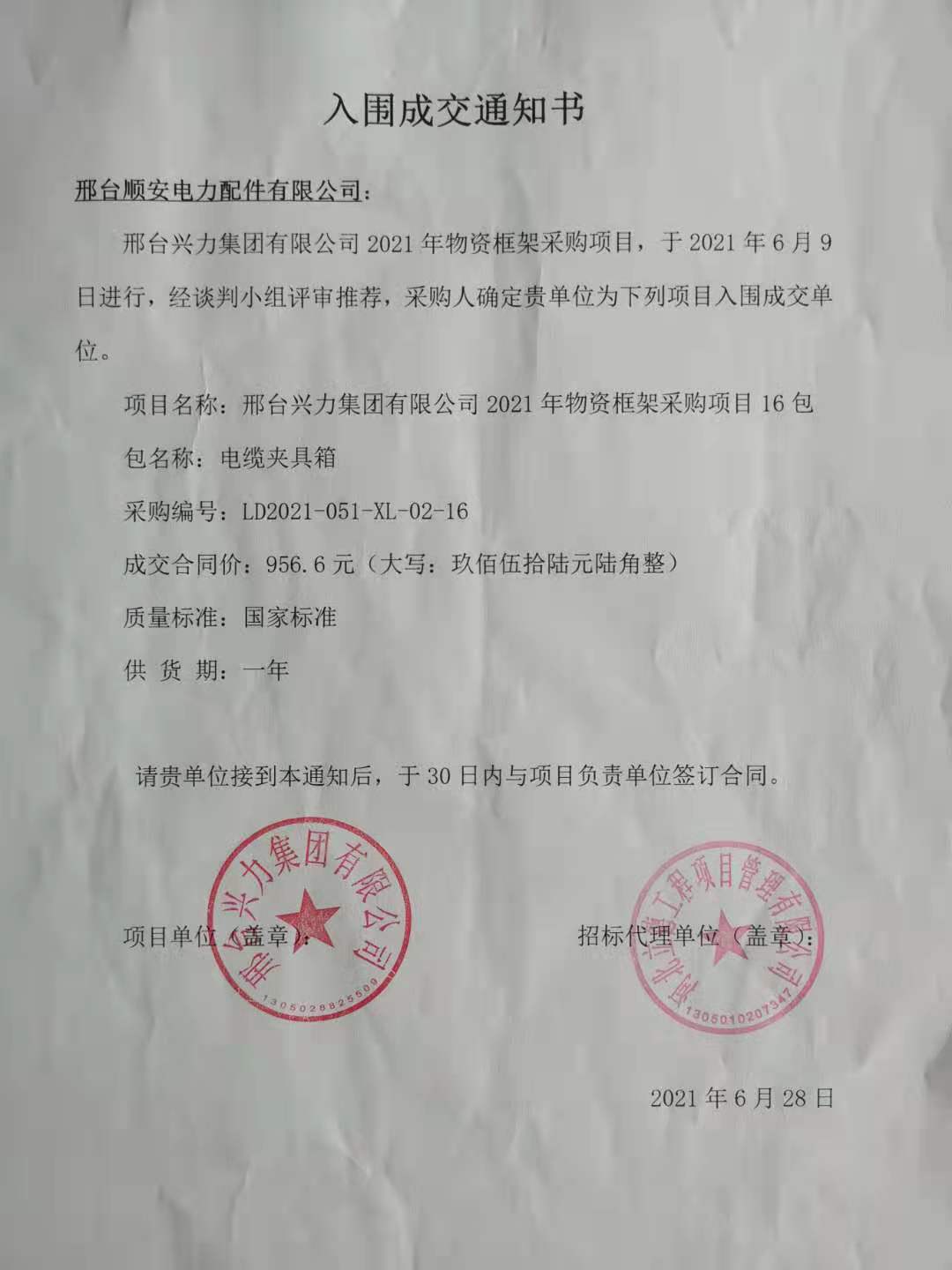 熱烈祝賀順安正式中標(biāo)入圍邢臺(tái)興力集團(tuán)2021年度物資框架采購項(xiàng)目。見入圍成交通知書。