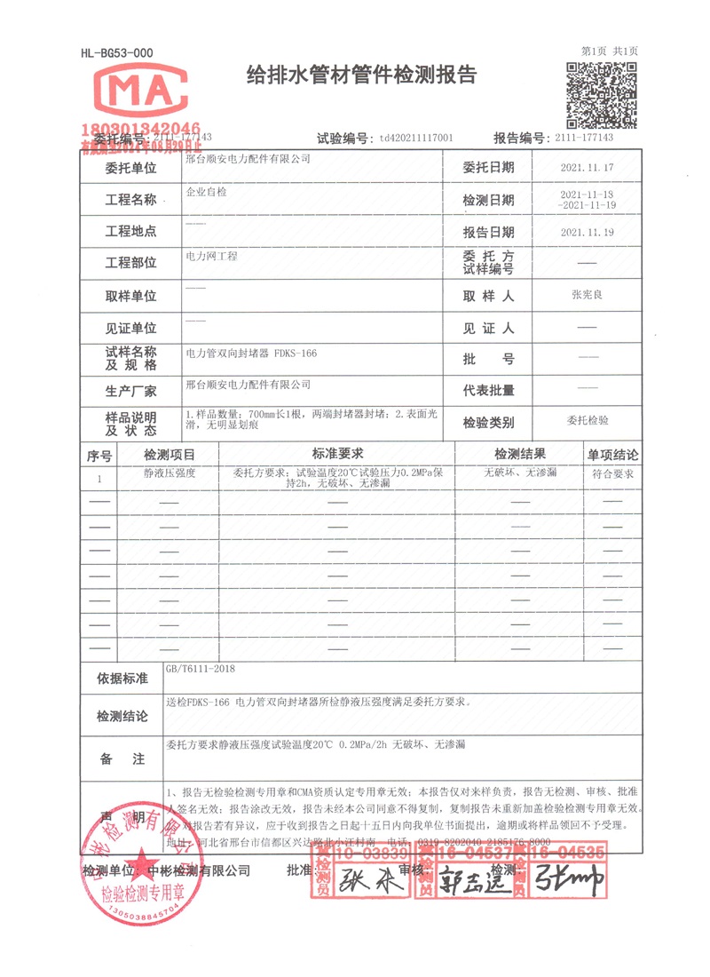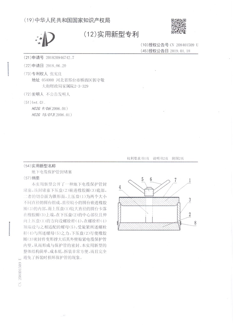為了滿足電力管對封堵器的質(zhì)量要求,我公司在2018年研發(fā)成功了電纜空管單向封堵器和雙向封堵器,并于2019年獲得了專利證書(見專利證書附件)。經(jīng)過3年以來的不斷改進(jìn)和完善,現(xiàn)已成功投放市場。同時將雙向封堵器FDKS-166型送國家權(quán)威機(jī)構(gòu)進(jìn)行了耐水壓檢驗,經(jīng)受了20米高水壓檢驗,也就是六、七層住宅樓房高度的水壓檢驗(見水壓檢驗報告)。