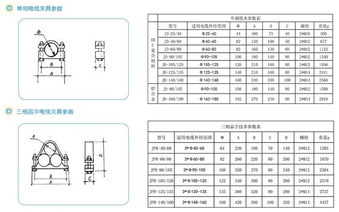 邢臺順安電力配件有限公司電纜夾具共有三大類,分別是復合材料電纜夾具、單相鋁合金電纜夾具(抱箍)和接地電纜夾具。目前單相電纜夾具有16種、三相品字電纜夾具有6種。照片及參數(shù)表如下: