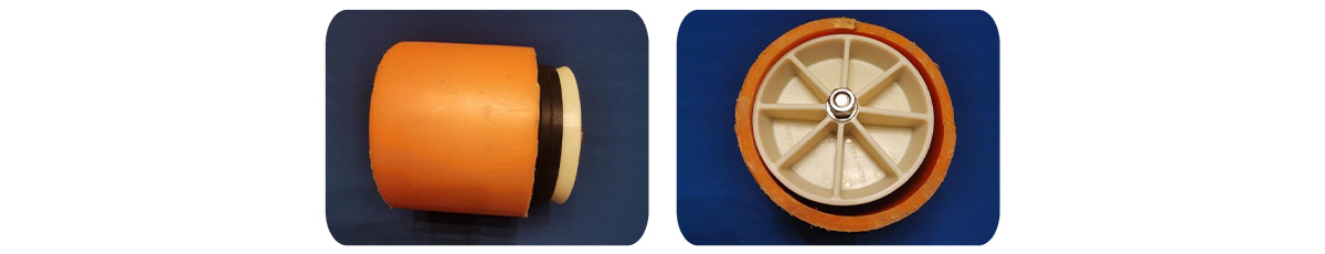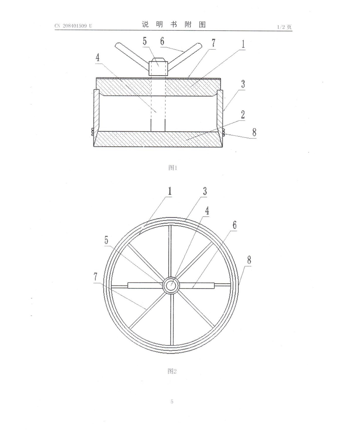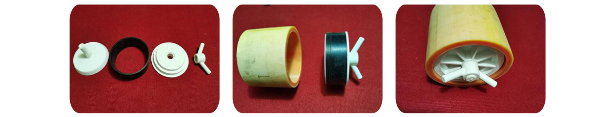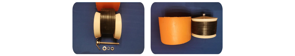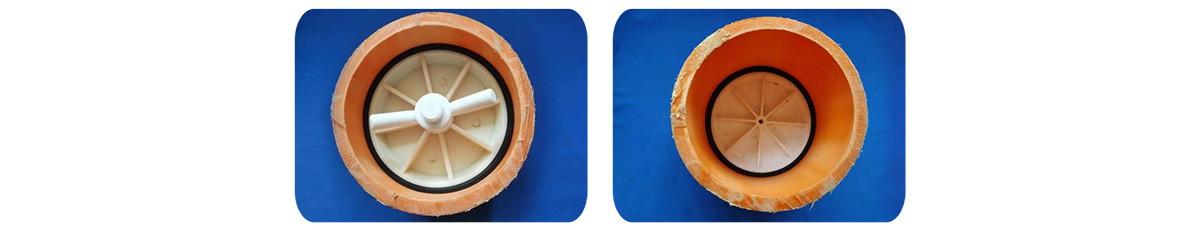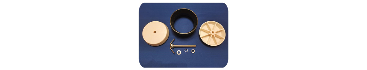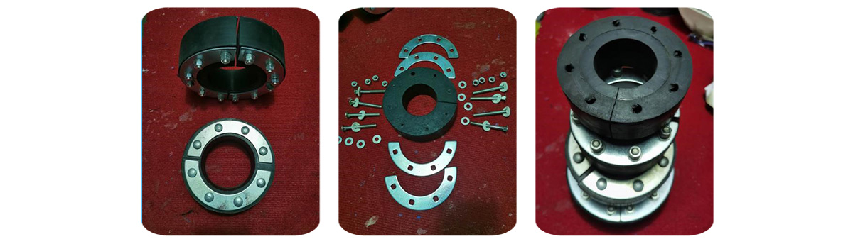 由兩個(gè)高強(qiáng)工程塑料制成的增壓盤(pán)、一個(gè)密封橡膠筒、一個(gè)密封墊和一套金屬螺栓(不銹鋼螺栓或熱鍍鋅螺栓)共五部分構(gòu)成如下圖: