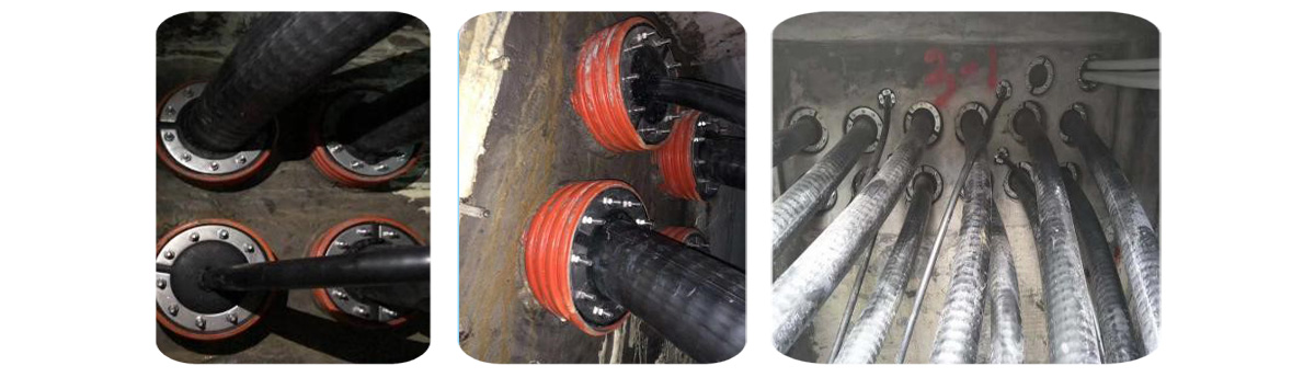 安裝時(shí)將封堵器初步裝配在一起,套在電纜上并將它推入電纜管內(nèi)合適位置后,將螺栓均衡逐步緊固到位即可。緊固時(shí)建議用套筒扳手緊固,若有條件最好使用電動(dòng)套筒扳手緊固。它的密封原理是通過(guò)螺栓縱向緊固橡膠圈,使橡膠圈橫向膨脹達(dá)到密封效果。