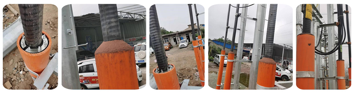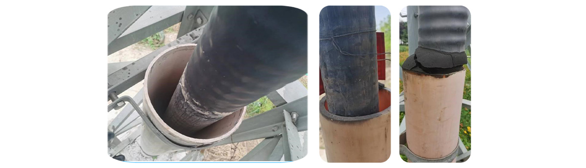 傳統(tǒng)終端桿塔電纜保護(hù)管口都是用防火泥進(jìn)行封堵,但是此種方式經(jīng)過(guò)一個(gè)夏季防火泥便開(kāi)始脫落了,經(jīng)過(guò)幾個(gè)夏季以后防火泥便脫落的干干凈凈。完全失去防護(hù)作用,平時(shí)積塵、雨天進(jìn)水、雪天積雪。見(jiàn)照片如下: